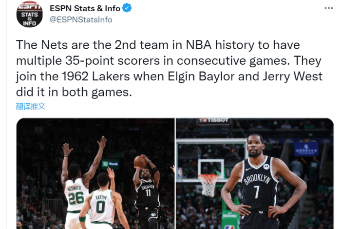也就是说,连续两场比赛,篮网都有两名球员同时砍下至少35分!据ESPN统计,他们是历史第二支在季后赛做到这一点的球队,1962年湖人队的杰里韦斯特和埃尔金贝勒曾连续两场季后赛同时砍下35+!