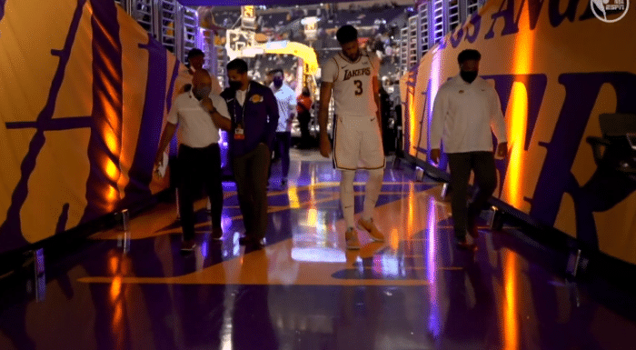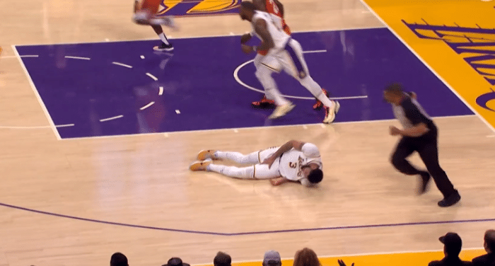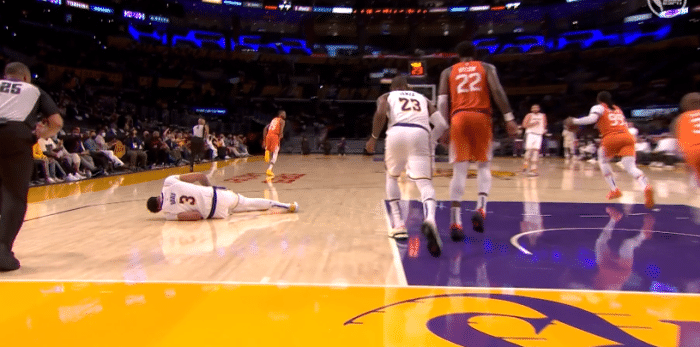 上半场快结束时,浓眉在一次上篮时不幸摔倒,当时浓眉捂着大腿内侧,躺在地板上十分痛苦,虽然他忍痛站起来,但一瘸一拐明显受限,走回更衣室途中,浓眉仍旧一瘸一拐;下半场浓眉没有首发上场(库兹马顶替其首发出战),也没有坐回替补席,而是留在更衣室接受检查。