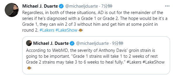 浓眉的伤势直接影响系列赛,若是一级拉伤,浓眉至少伤停1-2周,若是二级拉伤,浓眉至少伤停3-6周;由此可以看出,浓眉将因伤无法出战G5天王山大战,即使确诊为最轻的一级拉伤,浓眉也将首轮报销,无法出战首轮剩余的比赛,因此湖人卫冕的重担全都落在詹姆斯的肩上。
