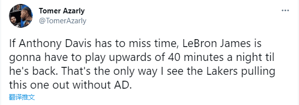 名记Tomer Azaly发推写道:如果戴维斯不得不缺席比赛,詹姆斯必须每场至少出战40分钟,直到浓眉回归。这是湖人在没有浓眉的情况下赢球的唯一方式。
