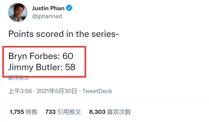 记者justin phan给出了一组扎心的数据,雄鹿角色球员福布斯这轮系列赛砍下60分超过了巴特勒!而这场G4,福布斯再次成为奇兵,三分14中7砍下22分!