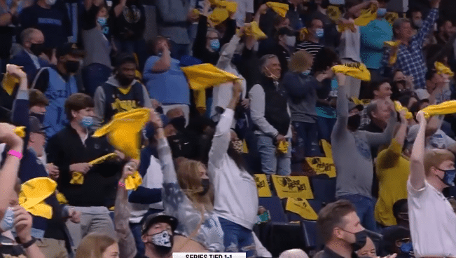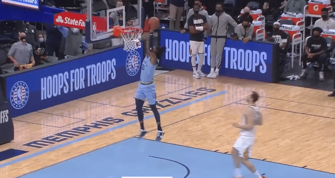到了第二节中段,狄龙-布鲁克斯成功抢断,随后他发起反击传球给到前场莫兰特,这位灰熊核心直接杀到前场,轻松起飞360度转身扣篮终结,相当的漂亮。镜头给到替补席和观众的时候,他们也都疯狂了,为莫兰特的这次精彩的扣篮鼓掌欢呼。