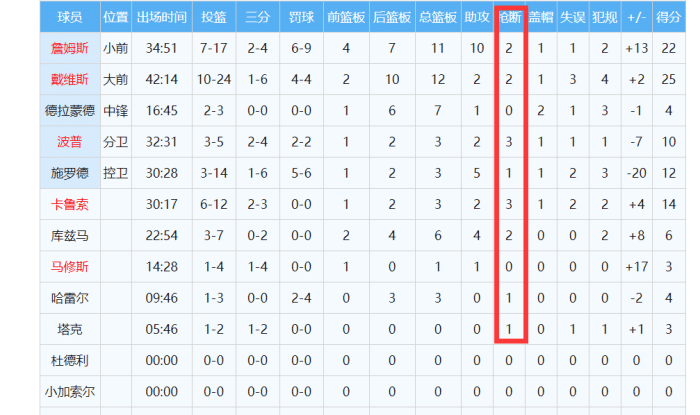 全场比赛,湖人送出了多达15次抢断,10名球员登场,其中有8人均有抢断贡献,波普、卡鲁索都是3次,詹姆斯、浓眉哥、库兹马也有2次进账。卫冕冠军让勇士出现了20次失误,其中库里和格林各6次!