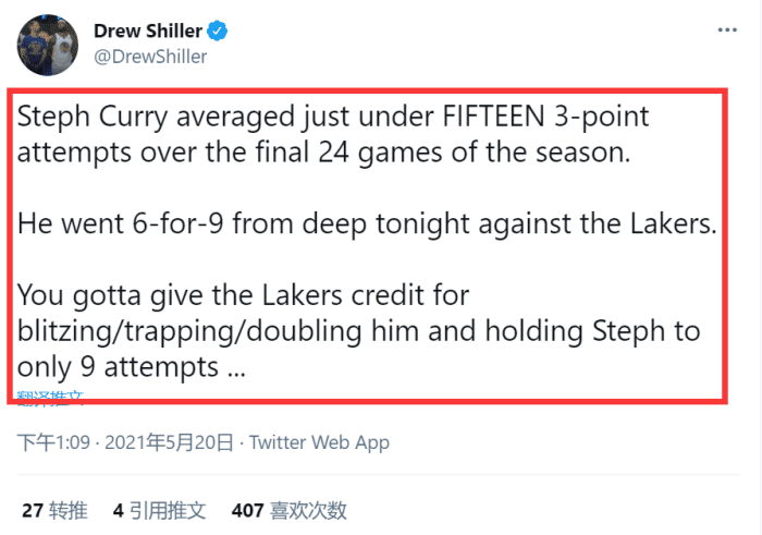 虽然库里这场比赛在斯台普斯中心终于打破三分魔咒,命中了多达6记三分!但需要注意的是,萌神全场被限制到只有9次三分出手!作为对比,据记者drew shiller统计,库里在常规赛最后24场场均要出手接近15个三分。而且比赛最后时刻,湖人也成功让库里出现接球失误,没有让后者得到追平比分的出手机会。