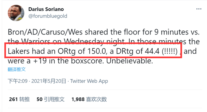 据美媒统计,在詹姆斯、浓眉哥、卡鲁索、马修斯这4人下半场同时出战的9分钟里,紫金军团打出了150的进攻效率,44.4的防守效率(百回合只让对手得44.4分),这样的防守实在让人觉得不可思议。而且这期间湖人净胜勇士19分,马修斯可以说是一大奇兵,卡鲁索整场比赛防守端几乎没有犯错,是湖人赢球最大功臣之一。