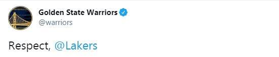 作为对手也给了湖人以及詹姆斯很高的敬意!勇士官推发文“尊重@湖人”科尔称赞“詹姆斯在关键时刻命中了那个很棒的球,我们交手过很多次,我清楚他的实力,他关键时刻站出来拿下了胜利。”