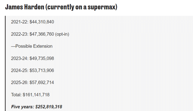 哈登目前正处在一份超级顶薪合同中,美媒预计哈登可以执行2022-23赛季的选项,然后再和篮网续签一份3年1.611亿美元的顶薪。他的未来5年薪水分布如下图:2021-22赛季4431万美元,2022-23赛季4736万美元(执行选项),2023-24赛季4973万美元,2024-25赛季5371万美元,2025-26赛季5769万美元。5年总薪水约2.528亿美元。
