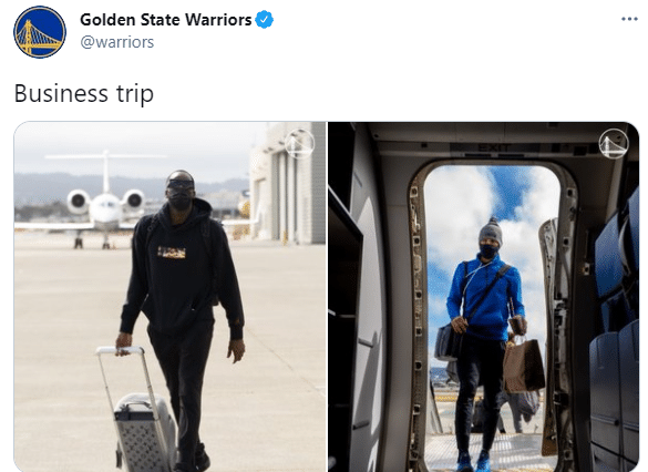 库里背着两个包——斜跨一个和单肩一个,手里提着一个袋子,还拿着一杯粉色的饮料(和此前哈登坐场边喝得类似);库里身穿蓝色运动外套和黑色长裤以及蓝色球鞋,戴着一顶针织帽,走进机舱。