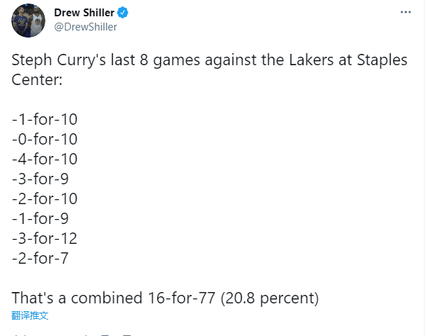 库里本赛季场均轰下32分夺得得分王,不过库里在湖人主场的表现并不好,据勇士记者报道,库里近8场在斯台普斯对阵湖人时总共77投16中,命中率只有20.8%,甚至出现10投1中以及10投0中的情况。