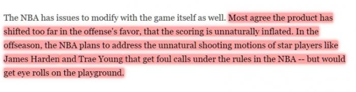 Shams认为“绝大多数人都同意,联盟现在过于有利进攻方,得分过于‘通货膨胀’了。在休赛期,NBA打算解决一些明星球员例如哈登、特雷-杨等人的非自然投篮动作(在野球场会遭白眼)在NBA能造成犯规的问题。”借此我们就能明白,针对的是哪方面的问题了!