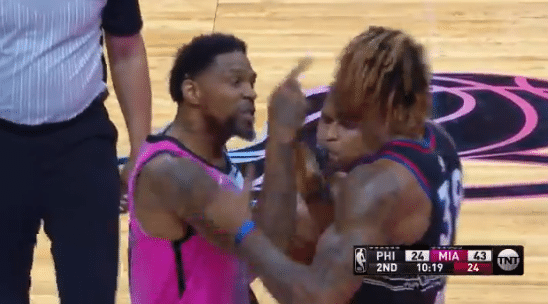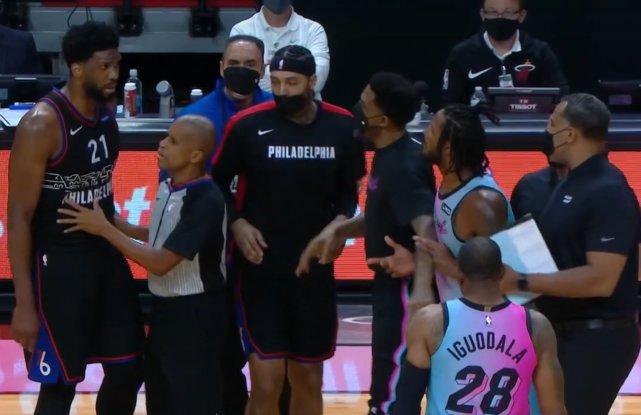 比赛的第一波冲突来自于阿里扎和恩比德,在第一节比赛进行到三分多钟,坐在替补席的阿里扎突然暴起,他冲向了费城核心恩比德就是一通怒骂,恩比德这边也是一边打球一边和阿里扎怒喷,为了避免冲突升级,热火队的助理教练一直劝阻着阿里扎。