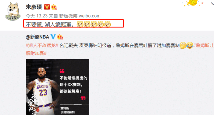 不过,国内篮球名嘴朱彦硕还是很看好湖人,他在社媒上回应了老詹抨击季后赛附加赛制度的动态,并配文,“湖人总冠军”。现在的湖人,你还看好夺冠吗?