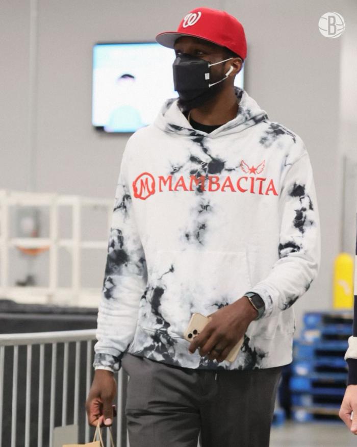 今天篮网和雄鹿赛前,篮网队也是多名球员身穿Gigi纪念服亮相,欧文送给全队这件运动服,杜兰特、欧文领衔出镜,其中欧文选择穿上一件更鲜艳的配色,还背着双肩包。