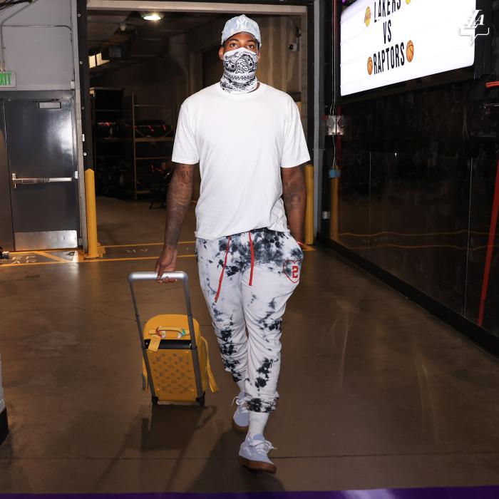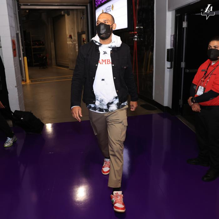 浓眉穿着长袖连帽衫和短裤,哈雷尔、卡鲁索等人都穿着长裤长袖的套装,还有球员穿连帽卫衣搭配其他裤子。