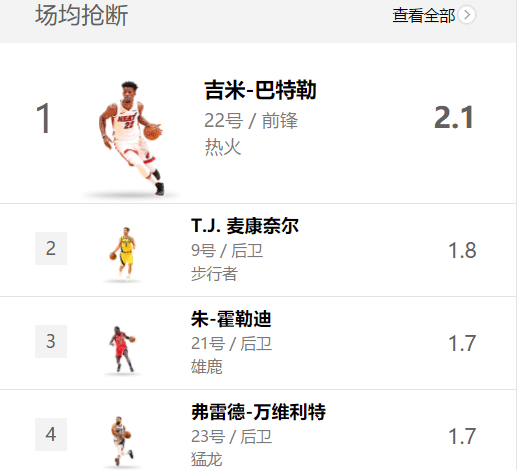 巴特勒也是本赛季第二位抢断数突破100次的球员,步行者的麦康奈尔抢断数是107次,他出战60场比赛,在场均抢断榜上以1.8次位居第二名,落后巴特勒的场均2.1次,对于抢断来说场均0.3次的差距还是很大的,再加上巴特勒不俗的状态,所以本赛季抢断王很有可能就属于这位热火核心。