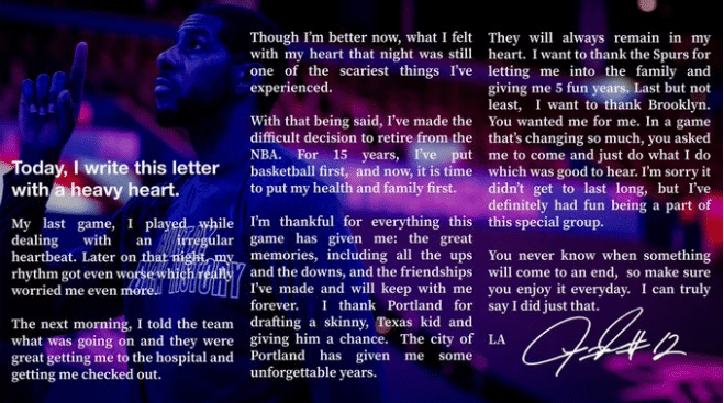 来源:24直播网04-16 11:5324直播网讯 篮网球星阿德在社交媒体上发布长文,正式宣布退役。这样的决定非常突然,尤其是在本赛季的阿德离开马刺,来到篮网追求生涯首冠。根据阿德的声明中可以看出,在和湖人的比赛结束之后,他心脏的问题变得严重,阿德称这是经历了最恐怖的事情之一,所以虽然目前阿德身体没有大碍,但出于健康和家庭层面的考虑,这位36岁的7届全明星宣布退正式役。