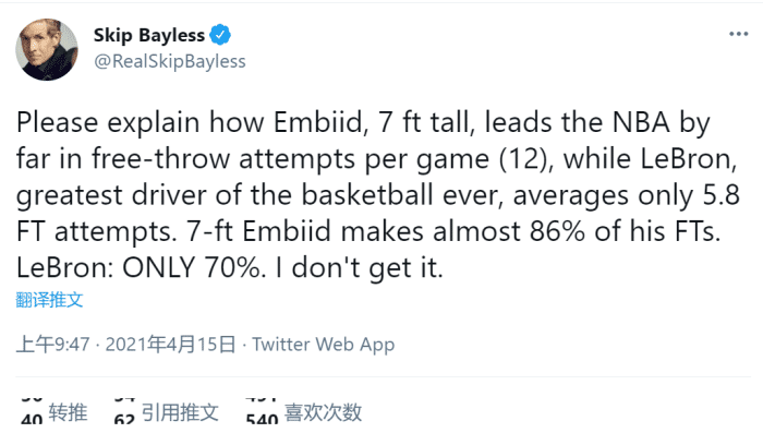 当然,bayless说的确实是事实,詹姆斯的罚球一直是他的软肋,十几年来,勒布朗的罚球命中率都是原地踏步。而大帝这赛季是全联盟最擅长造犯规的球员,罚球命中率也相当可观。考虑到恩比德只因伤休息了十来场比赛,所以他仍然有机会获得今年最有价值球员!