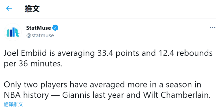 据statmuse统计,恩比德本赛季每36分钟可以送出33.4分12.4板,NBA历史上此前只有字母哥和张伯伦能打出这种效率!