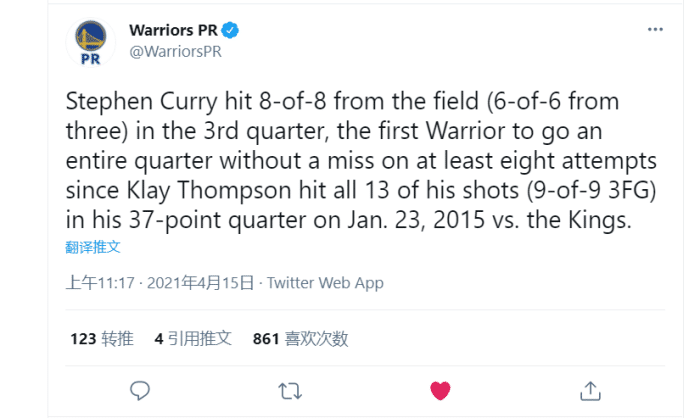 据勇士官方统计,库里是2015年汤普森后第一个在单节至少出手8次且全部命中的勇士球员,众所周知,克莱在2015年对阵国王的比赛中13中13三分9中9狂砍37分创造历史单节得分纪录!虽然库里今天的单节表现跟汤普森相比还是差了一点,但单节8中8三分6中6仍然足够疯狂!