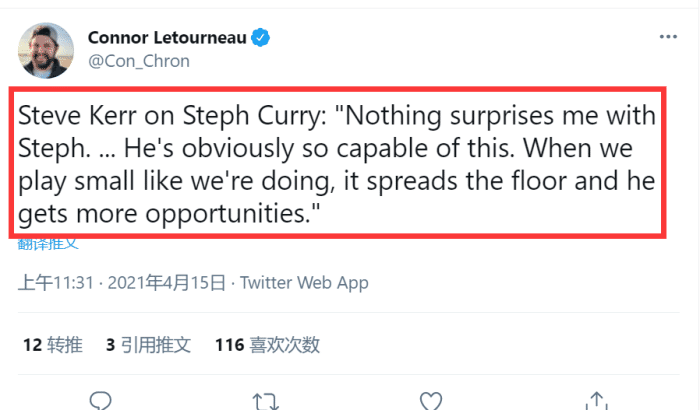 对于库里今天的炸裂表现,勇士主帅科尔在赛后接受采访时表示:库里打成这样我其实一点也不惊讶!他就是这样一位有能力做到这些的球员!