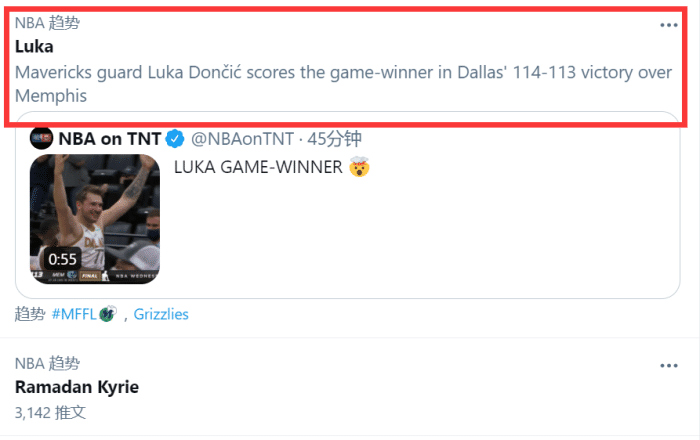 这次绝杀也让东契奇的名字第一时间冲上了推特热搜榜!很多美媒表示不敢相信!包括湖人当家球星詹姆斯也发推感叹!