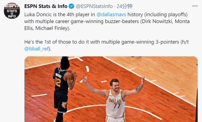 虽然这只是东契奇生涯第3个赛季,但算上去年季后赛首轮第4场绝杀快船,也就是说,东契奇已经命中2次压哨绝杀,据ESPN统计,卢卡就此成为独行侠队史第4位做到这一点的球员,前3人分别是芬利、埃利斯以及诺维斯基。与此同时,东契奇也是独行侠队史第一位两次命中三分压哨绝杀的球员!真的是年少有为啊!