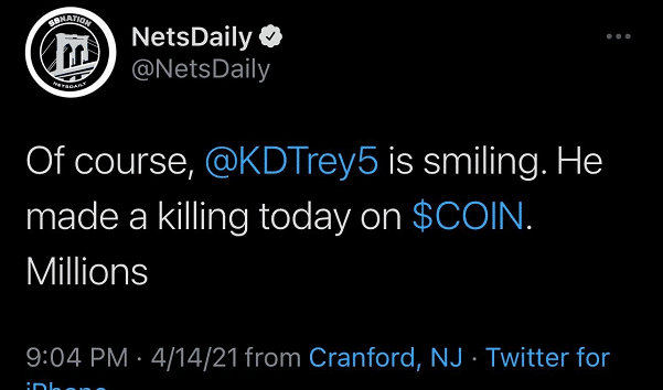 很快就有球迷发现,篮网输球,杜兰特在场下偷笑,称杜兰特确实应该笑,因为他在场外已经赚疯了。这里说的是杜兰特场外的投资,他和团队投资的Coinbase的数字货币交易平台成功上市,杜兰特确实赚疯了。