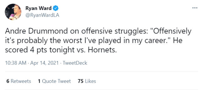 来源:24直播网04-14 20:2124直播网讯 北京时间4月14日,湖人101-93击败黄蜂,德拉蒙德出战24分钟,7投2中,得到4分12篮板1助攻3抢断2失误4犯规。他在进攻端的表现依然不佳,加盟湖人以来,庄神40投18中,命中率只有45%。赛后,德拉蒙德在采访中说道:“这很可能是我生涯里进攻最差的一季。”