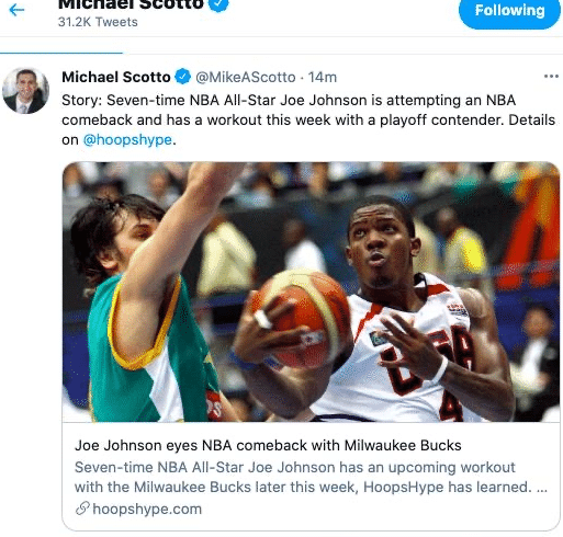 据HoopsHype记者MichaelScotto的报道,他们已经获知乔-约翰逊将为雄鹿试训,目前球队还剩下一个名额,球队战绩东部第三的位置。乔约翰逊是7届全明星,01年的首轮10号秀,目前已经40岁了,但仍没有退役的打算,短暂离开NBA后他开始打BIG3联赛,并为美国队出战了美洲杯比赛!
