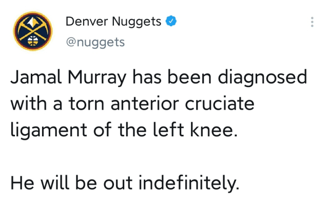 恢复期至少11个月!穆雷十字韧带撕裂赛季报销,掘金或考虑签约两人