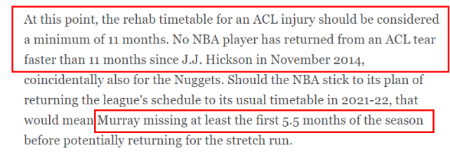 自从2014年的希克森以来,没有一名NBA球员遭遇此类伤病的恢复期少于11个月,因此,穆雷的恢复周期预计至少11个月。如果2021-22赛季按照正常时间进行,穆雷也很可能要缺席下赛季的前5.5个月。
