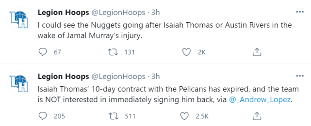 美媒Legion Hoops报道称,签约鹈鹕的小托马斯10天合同已经到期,鹈鹕没有立刻和他续签合同的兴趣,而失去穆雷的掘金有可能考虑签下他,除了小托马斯,小里弗斯是掘金会考虑的另一个目标。