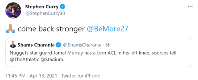 “我爱我们球队所有球员,痛恨看到他们中有人因为伤病倒下。”掘金主帅迈克尔-马龙说道,“贾马尔(穆雷)对我们来说极度重要。我知道他现在感觉很受伤,我也一样。”穆雷左膝十字韧带撕裂的伤情公布后,多位NBA球星在社媒上祈祷他早日康复。库里写道:“归来后更加强大!”