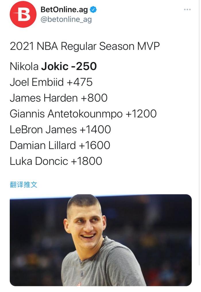 大概从前两周开始,约基奇就一直霸占着官方MVP榜单的第一位,因为约基奇近期的表现真的是太好了,之前还带领球队拿到一波七连胜。尽管约基奇在个人数据方面可能比不上同位置的恩比德,但是在球队战绩的加成之下,恩比德的赔率也比不上约基奇。约基奇也是这份榜单中唯一一个赔率达到-250的球员,由此可见约基奇在MVP的竞争中有多么热门。
