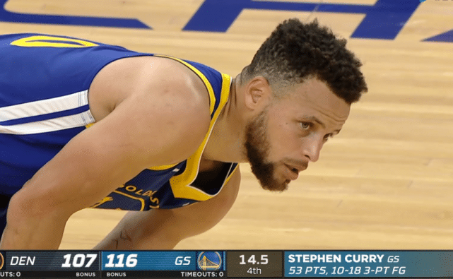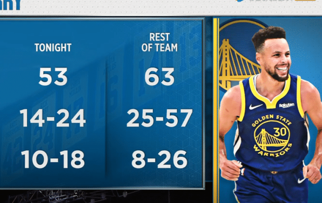 库里本场比赛的表现堪称爆炸,首节比赛便狂轰21分,超越张伯伦成为勇士队史得分王。三节比赛,库里已经轰下了48分。最后一节,本赛季悬念并不太大,库里最终将得分锁定在53分。这也是库里本赛季第3次拿下50+,全联盟最多。此外,库里也成为NBA首位在33岁还能单赛季3次50+的球员。