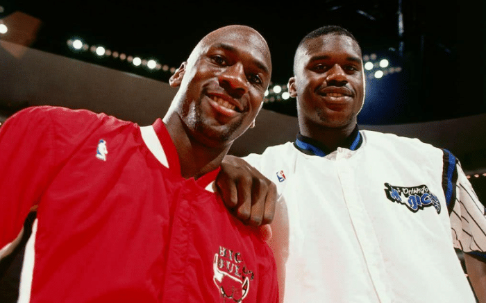 乔丹和奥尼尔打首发,基本上没悬念,乔丹是历史上最伟大的球星,而奥尼尔则是最具统治力的中锋,三连冠时期,奥胖在总决赛中砍下30+10,就如同家常便饭,别人能在最最高舞台拿到30分,就可以吹上天了,但对他来说就是小菜一碟。