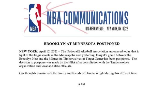 来源:24直播网04-13 11:4224直播网讯北京时间4月13日,NBA官方宣布,鉴于昨天在明尼阿波利斯地区发生的悲惨事件,今晚(当地时间)布鲁克林篮网队和明尼苏达森林狼队在标靶中心的比赛将推迟进行。比赛延期的决定,是NBA在征询森林狼队以及当地官员后做出的,在公告中,联盟还对当特-赖特的家人和朋友致以哀思。