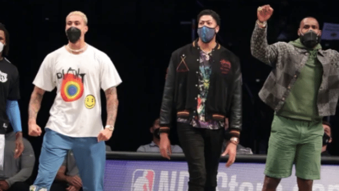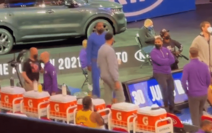 比赛非常激烈,詹姆斯没有和以往一样在替补席给队友们加油助威,他在场外连续的运球,胯下、背后运球,球感也很好。这个时候浓眉哥端着水杯慢慢的走过来,两人聊着天。