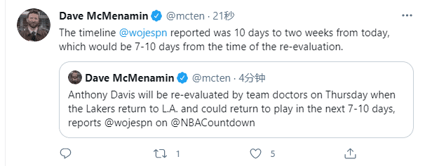 浓眉何时才能伤愈复出?据湖人记者Dave McMenamin报道,浓眉将在结束客场之旅,也就是周五返回洛杉矶后重新接受医生的评估,重新评估后7-10天内伤愈复;从现在开始算起的话,浓眉可能在10-14天内复出,最快10天后复出。