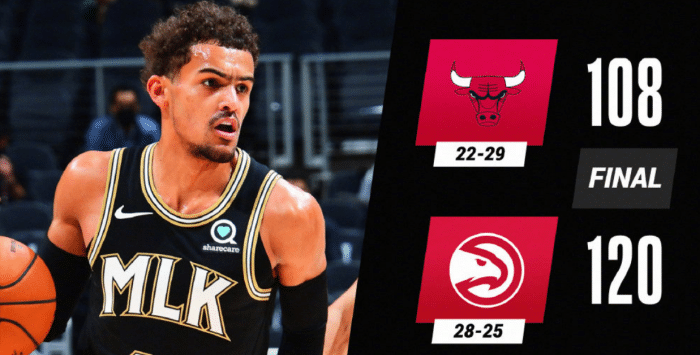 公牛和老鹰的对决,拉文开场就是手感火热,连续拿到10分,4投全中,单节拿到14分。次节比赛拉文还是手感非常出色,单节命中5个三分球,单节就是拿到25分,半场39分,本赛季联盟半场得分新高,他成为1997年乔丹之后,公牛首位半场拿到30+的球员。不过到了后两节,拉文被特雷杨压制,他后两节只拿到了11分,而特雷杨在后两节拿到了24分,带领老鹰120比108完成逆转,拿下比赛。全场比赛,拉文50分,特雷杨42分9次助攻和8个篮板。