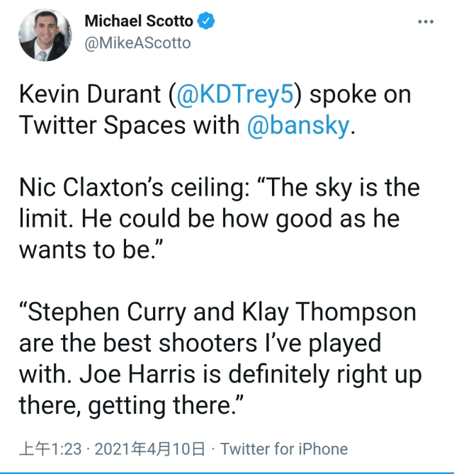 杜兰特称赞两大队友!哈里斯接近水花兄弟,21岁小将天空才是极限