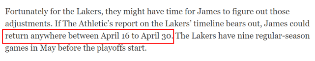 Mark Medina最后表示,如果The Athletic之前报道的复出时间无误,詹姆斯有望在当地时间4月16日-4月30日之间回归,而湖人5月份还有9场常规赛,届时,詹姆斯可以在季后赛到来前再热热身。