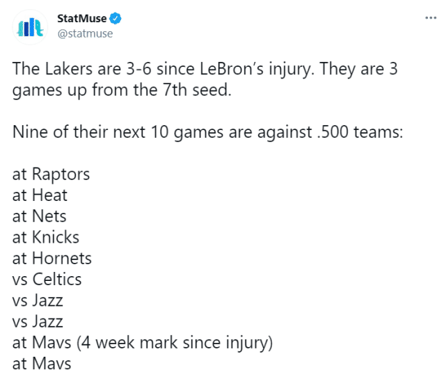 自从詹姆斯缺阵以来,湖人只取得3胜6负的战绩,排名降到西部第五。他们只领先西部第七的独行侠3个胜场了。如果湖人不能尽快反弹,他们完全有可能掉到附加赛的范围内。