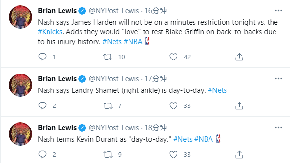 在赛前接受了媒体采访,纳什谈到队内伤情:哈登将伤愈复出,而且哈登今天不会有出场时间限制;此前哈登因腿筋紧张缺席两场比赛,如今“打工人”哈登伤势痊愈,重返工作岗位而且没有限时令。