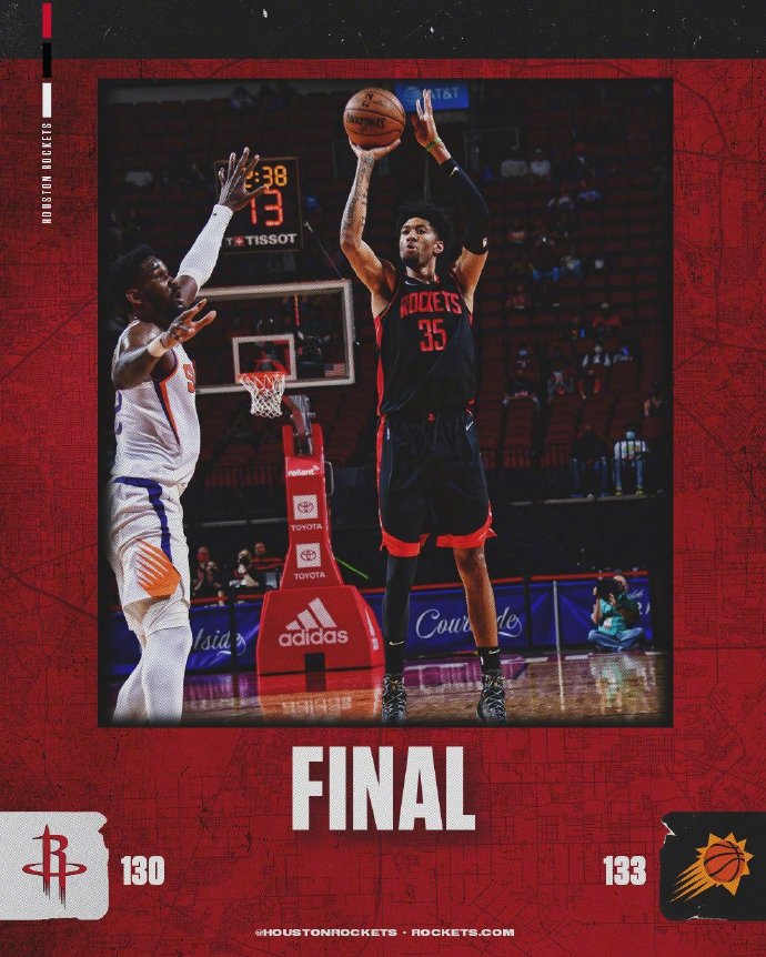 末节,火箭连得9分追平比分,太阳没给火箭立马实现反超的机会。但火箭在中段还是连得4分实现反超。太阳在末段轰出21-7攻击波将分差扩大至11分,带着9分优势进入最后一分钟。火箭连得6分追至3分分差,最终太阳以133-130险胜火箭取得六连胜。