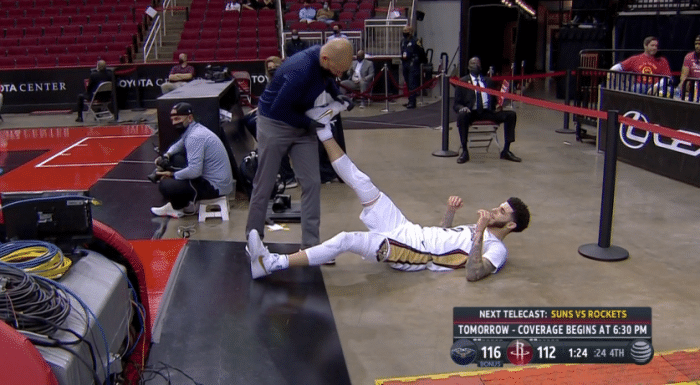 最后90秒关键时刻,鲍尔累得腿抽筋而被迫下场,队医赶紧为他治疗一下,随后鲍尔再也没有上场,坐回替补席,最终鹈鹕有惊无险拿下胜利;此前鲍尔因腿部拉伤连续缺席7场比赛,由于鹈鹕伤病满营,鲍尔提前复出,复出第一场便狂刷纪录。