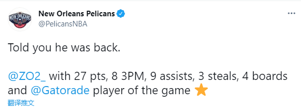 鲍尔复出首战打出疯狂一战,鹈鹕官方连续更新多条动态,狂吹鲍尔;鹈鹕官推先是晒出鲍尔抱着枪射击找,写道:他没有投丢;然后晒鲍尔本场的数据,写道:就是告诉你他回来了。