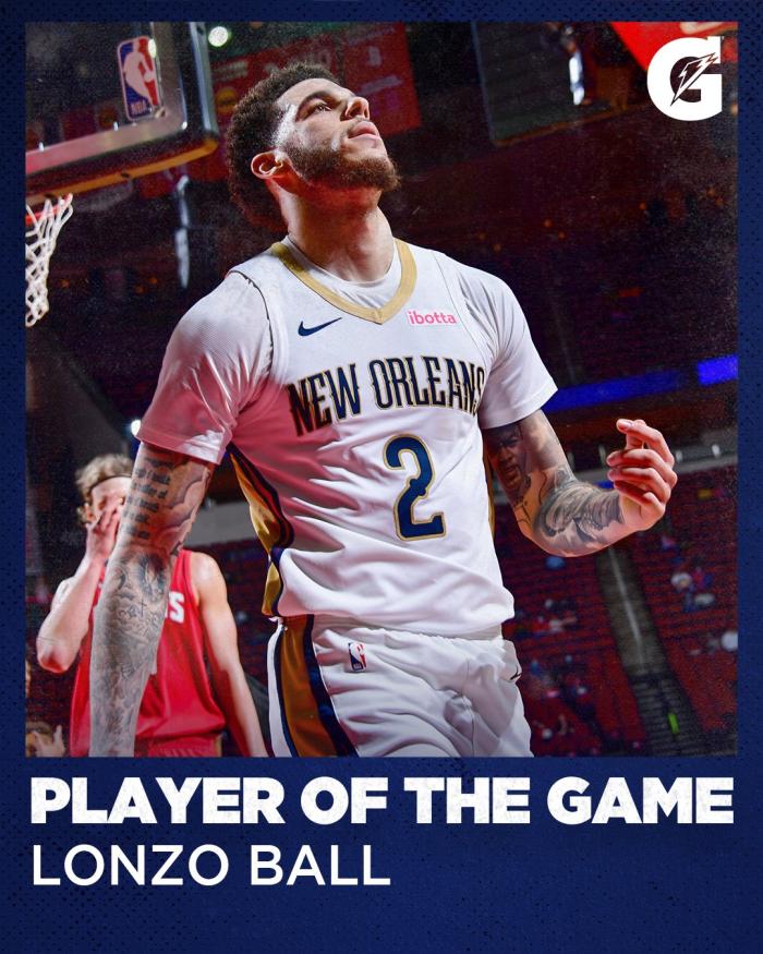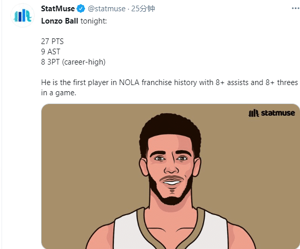 鲍尔投进8记三分球,创生涯单场命中三分新纪录,也是鹈鹕队史单场第二高纪录;鲍尔也成为鹈鹕队史第一位单场至少8记三分且8次助攻的球员;23岁榜眼鲍尔复出便带队赢球,没有锡安和英格拉姆也没有问题,赛后鲍尔表示:我抽筋了,会准备好下一场比赛。