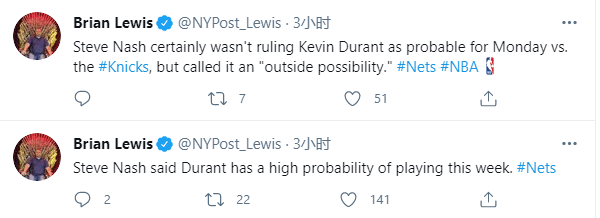 杜兰特复出时间曝光,据篮网主教练纳什透露,杜兰特有可能复出对阵尼克斯,即使不打同城德比,杜兰特下周也是大概率会复出;篮网下周将会先后对阵尼克斯、鹈鹕和湖人,预计杜兰特将很可能复出;此前shams透露杜兰特已经无限接近复出。