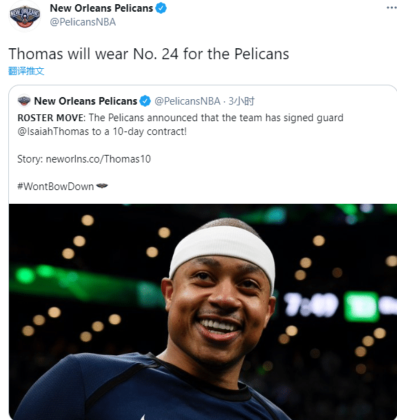 来源:24直播网04-04 14:0824直播网讯新奥尔良鹈鹕官宣,正式签约小托马斯,双方签下一份10天短合同,时隔一年多,小刺客终于重返NBA,恭喜地表最强175回来了;鹈鹕还官宣小托马斯将会身穿鹈鹕24号球衣,小托马斯回应改穿24号的真因,名宿恭喜小托马斯重返联盟。